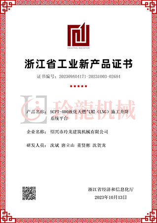 SCPT-400液化天燃?xì)獯↙NG)施工升降系統(tǒng)平臺(tái)新產(chǎn)品評(píng)價(jià)證書(shū)
